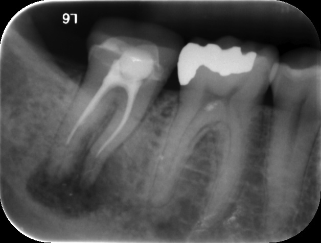 Note a área escura sobre a raiz, indicando uma infecção crônica
